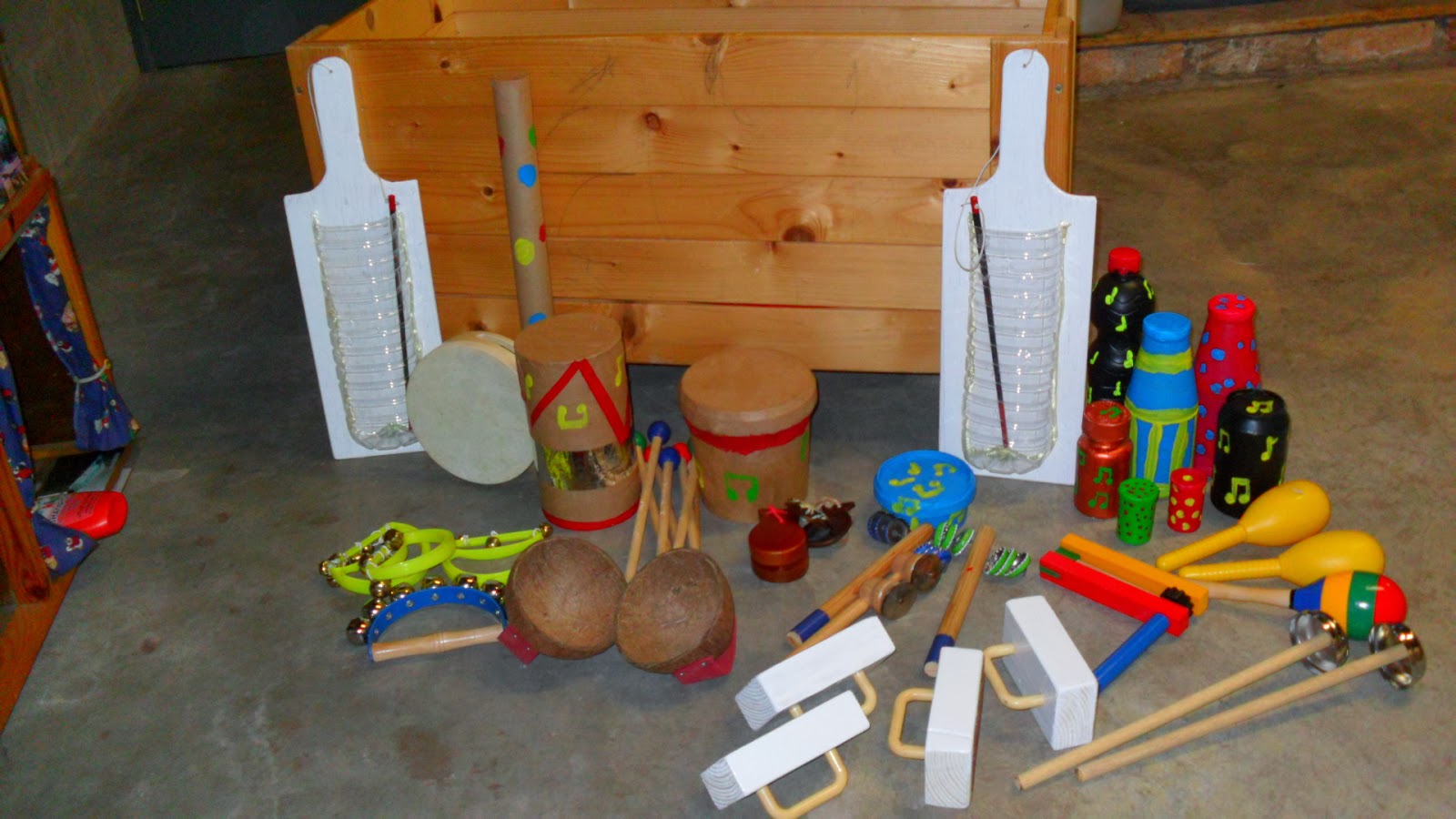 De kleuters krijgen gevoel voor ritme, maken plezier, zingen en dansen. Maar muziekinstrumenten zijn duur en daarom heb ik ze zelf gemaakt.